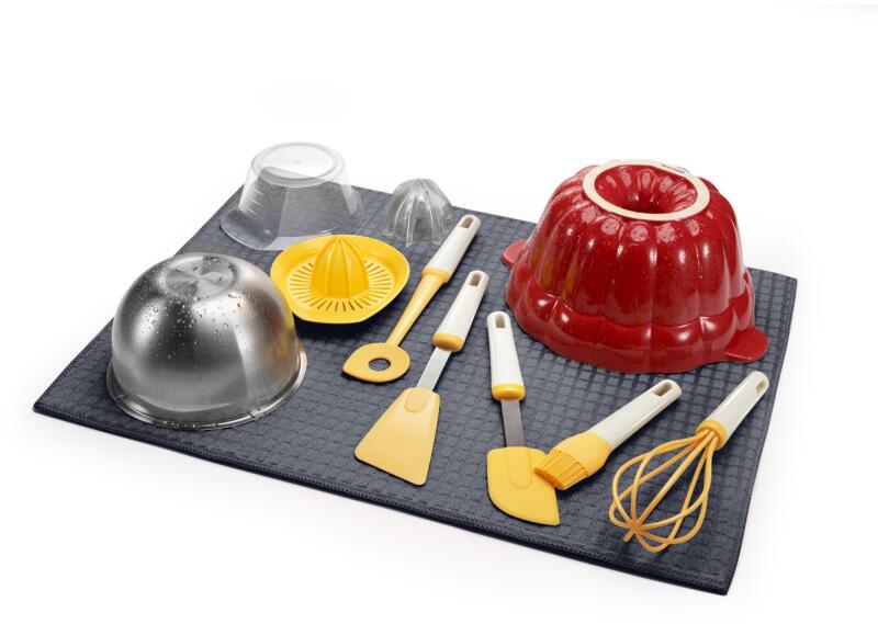 Kiválóan alkalmas nagyobb mennyiségű edény szárítására,  hatékony nedvszívó betétje megbízhatóan felfogja a lecsorgó vizet, és puha textil felülete megvédi az edényt a sérüléstől. A textilcsepegtető használat után könnyen feltekerhető vagy összehajtható.  30 °C-on mossa, hagyja megszáradni, ne tegye szárítógépbe. 3 év garancia.